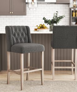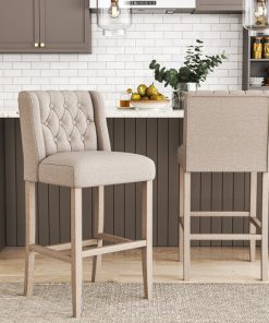 Rustic Set of 2 Bar Stools Linen Tufted with Wood Legs