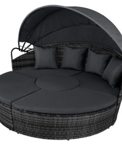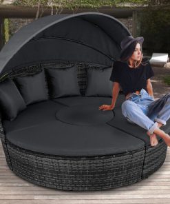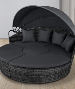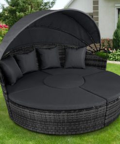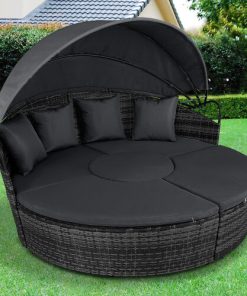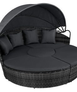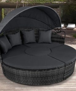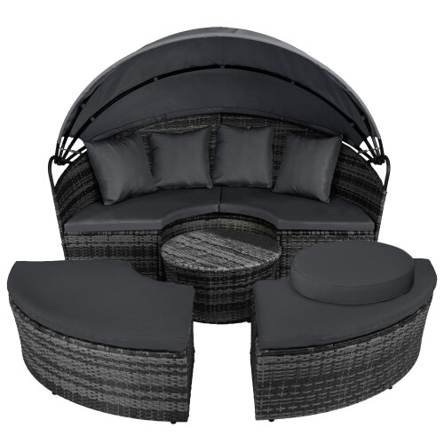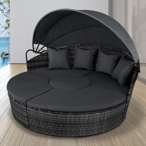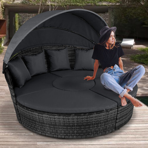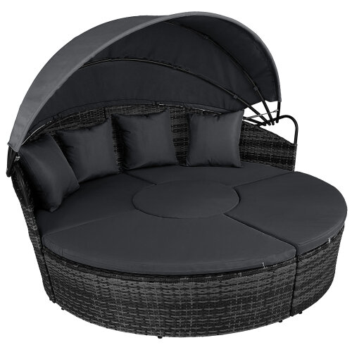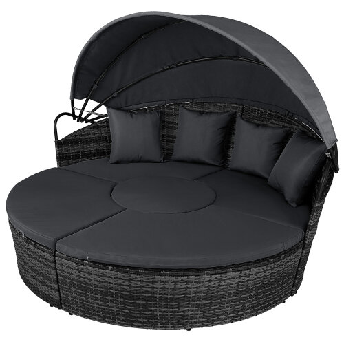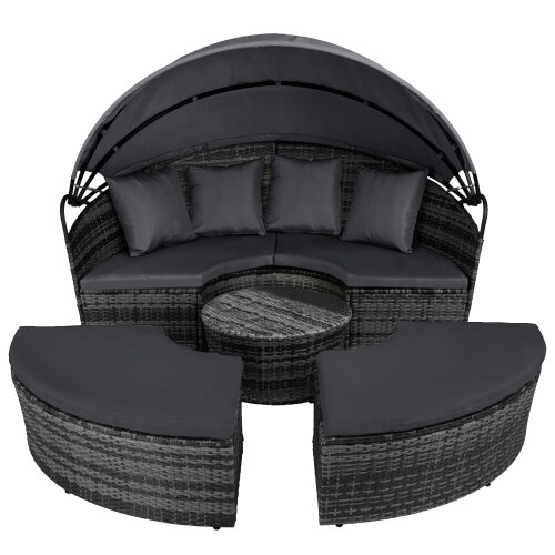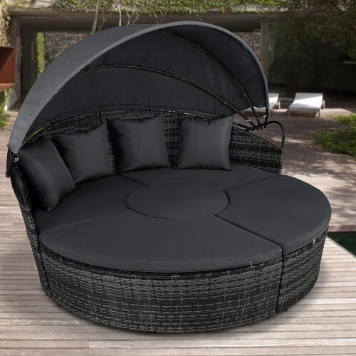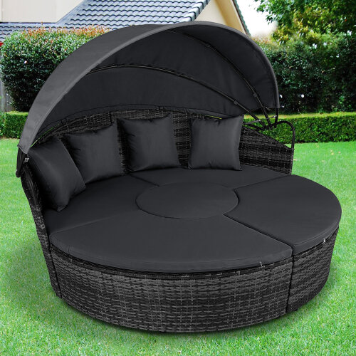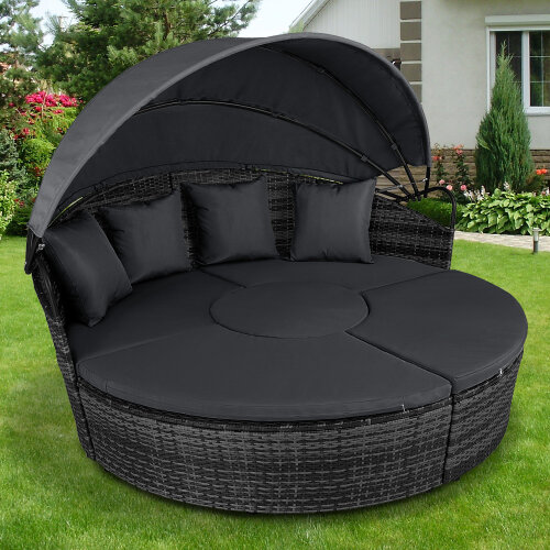5 Piece exclusive Rattan Island Lounger Day Bed from Daniel James ProductsThe set include of two quarter round chairs, two quarter round chairs and a round table.Overall Dimensions: (Diameter)180cm x (Height)142cmUsing metal as the base frame for a strong and sturdy structure, each piece is wrapped with PE rattan to provide a shield against light weather.?Thick cushions are placed on each seat for comfort, with removable and washable covers, with a large overhead canopy completing this set to offer you protection from sun glare and wind.?An innovative and exclusive design.Large outdoor bed formed of two quarter chairs, two quarter chairs with backs and a round stool chairMetal under-frame for a sturdy structure, with PE rattan wrapped aroundDouble the strength and resilience against weathering and damageRetractable overhead canopy, will block out sun and rain to allow you to restThick 5cm Seat cushions for comfort ¨C removable covers can be washedAdjustable feet for continual balance and stabilityUnique design for relaxing comfortably by yourself or with friends in your garden and outdoorsMaximum load 160kgSimple Assembly RequiredColor: Deep Grey Rattan & Grey CushionsMaterial: PE Rattan, Metal, PolyesterMax Load: 160kgWeight: 50kg