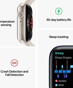 Apple Watch Series 8 features advanced health sensors and apps, so you can take an ECG, measure heart rate and blood oxygen, and track temperature changes for advanced insights into your menstrual cycle. And with Crash Detection, sleep stages tracking, and advanced workout metrics, it helps you stay active, healthy, safe, and connected.