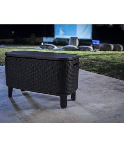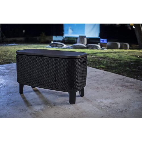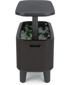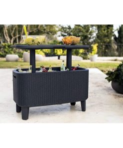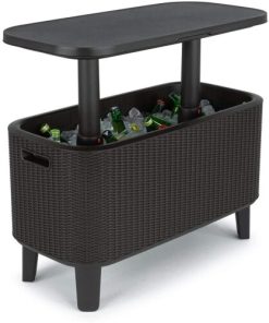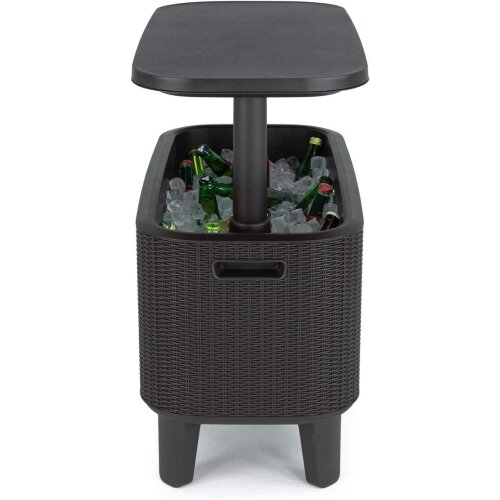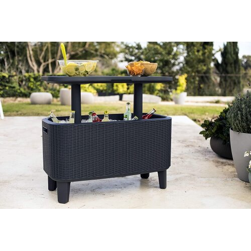 Spice up your outdoor entertainment space with the Keter Bevy Bar Serving Station. You and your guests will love the convenience this bar cart provides with an adjustable height tabletop and easy access to refreshing drinks and delicious treats. Ideal for weekend get-togethers and family celebrations, this side table features a 60-liter open ice compartment for keeping beverages chilled and within reach of your guests. The cocktail table is ideal for placing snacks, utensils, and much more. Adjust the height of the table to fit your environment, convenient for both sitting and standing applications. Use the simple one-press action to gradually close the top for easy use and storage. Functional and stylish, this coffee table requires no maintenance, resists fading, and is easy to assemble. Constructed of polypropylene resin with an integrated drain plug, this flat bar accessory provides a quick cleanup and is suitable for indoor and outdoor use. Be the best host and delight your guests with the efficient Keter Bevy Bar Cooler Serving Station.