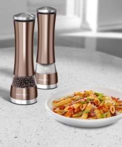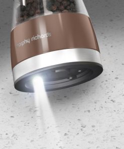 These Accents Copper Electronic Salt & Pepper Mill from MorphyRichards will add seasoning to your salads and soup with a simpletouch of a button. Its acrylic window allows you to monitor pepperand salt levels to refill when required. An illuminated LED baselights up when used to see how much you’re sprinkling. This batteryoperated Salt & Pepper mill will look good in any kitchen whileminimising the risk of adding too much salt or pepper to yourprepared meals.