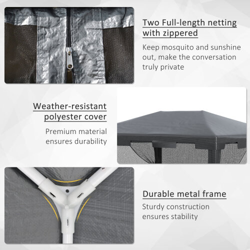 Grab your favorite drink and enjoy the shade of freedom with this marquee gazebo with sides. The sturdy frame adds a durable place for you to relax in the shade. This party gazebo is perfect for any occasion such as family gatherings, picnics, camping or tailgates. Powder-coated steel frame covered with a UV resistant and water-resistant PE cloth for shelter. The mesh sidewalls make it great for keeping bugs out, so you can enjoy the outdoors even if the sun goes down.
