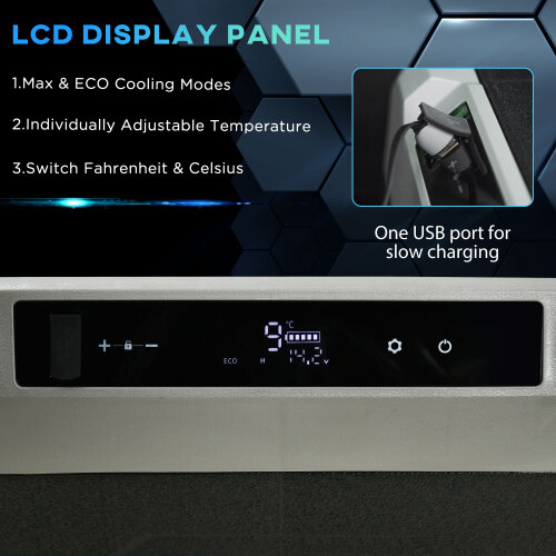 - LED PANEL: Equipped with LED panel allows you to adjust the temperature range at any time. And you would choose max mode for fast cooling or ECO mode for energy saving. And our portable camping fridge average energy consumption is only 60W