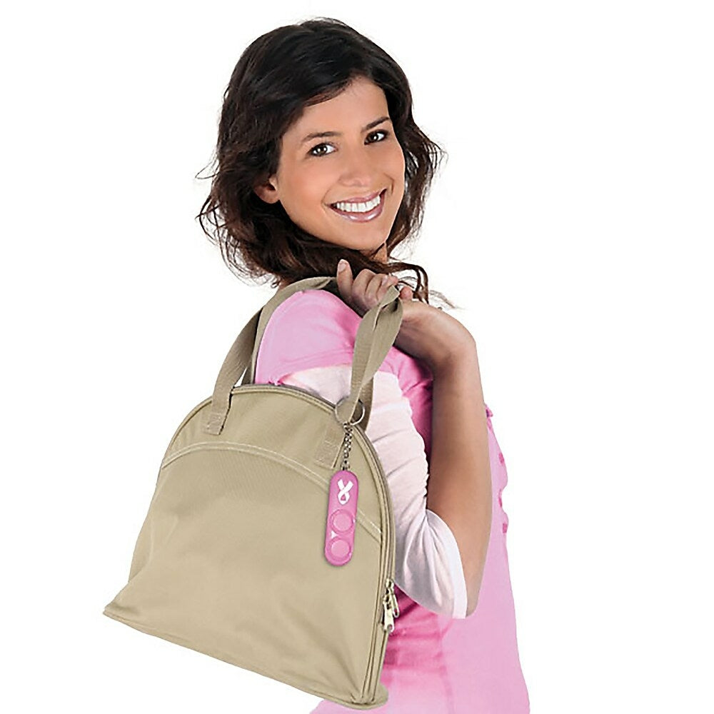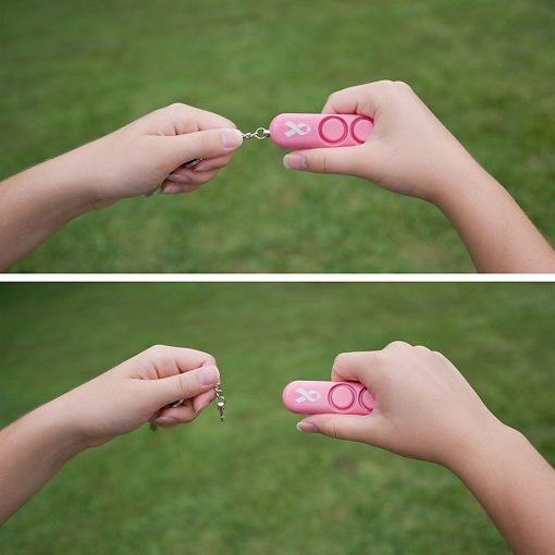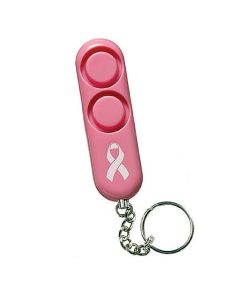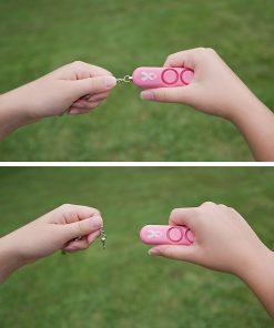 This pink, sleek, compact modern design keychain attaches to backpack, purse or keys for convenient, instant access, plus greater value with batteries included (requires 4xLR41). The 110 dB dual siren alarm helps call for assistance in an emergency and helps deter attacker (audible up to 600 feet/185M away). Simple to use and reusable; pull metal chain from device to sound 110 dB alarm; push pin back in to stop sound and use again. Safe for children, and a self-defense option for any age. Supports NBCF (National Breast Cancer Foundation).